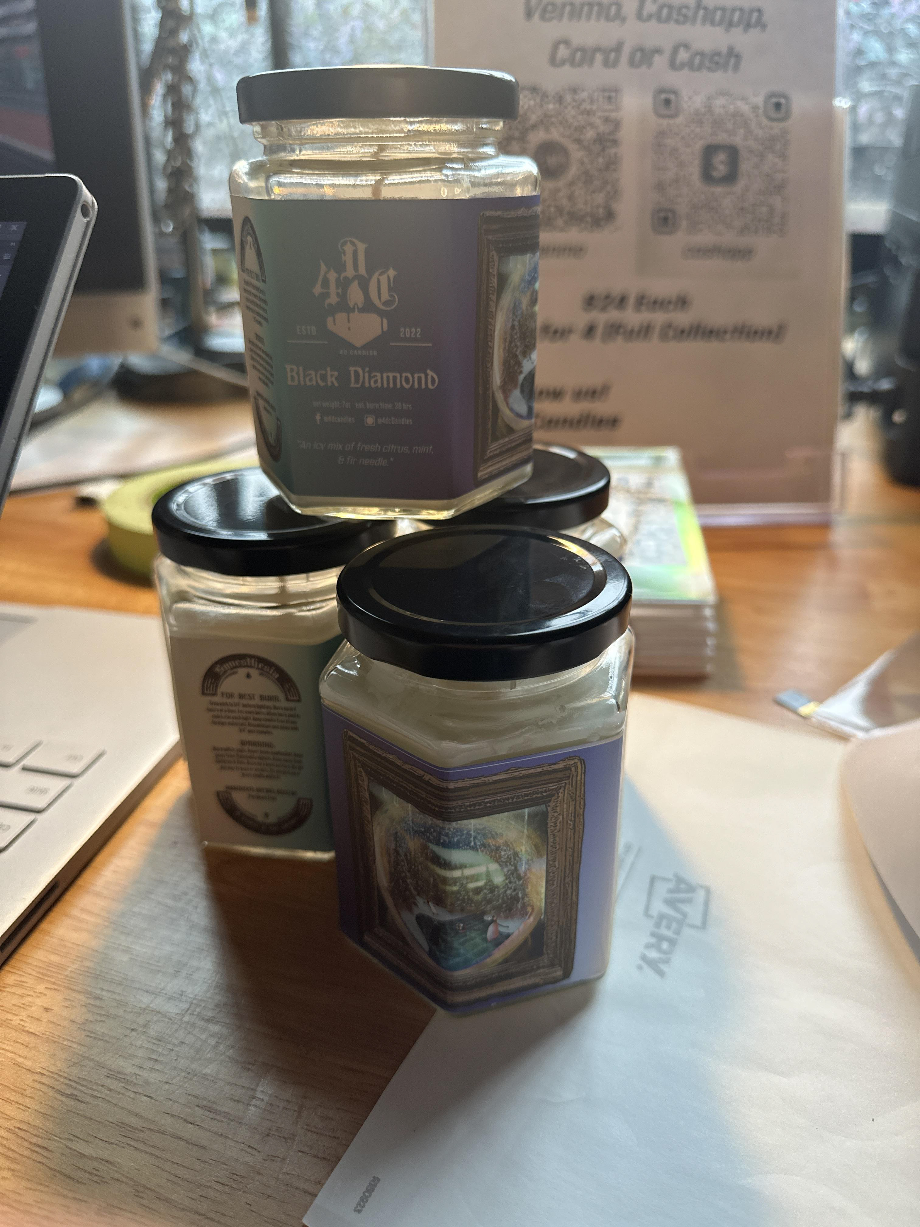 Each artist is compensated per candle sold as a royalty for allowing me to use their piece. I am very grateful to have been able to support 9 local artists over $2500 total in 2023!